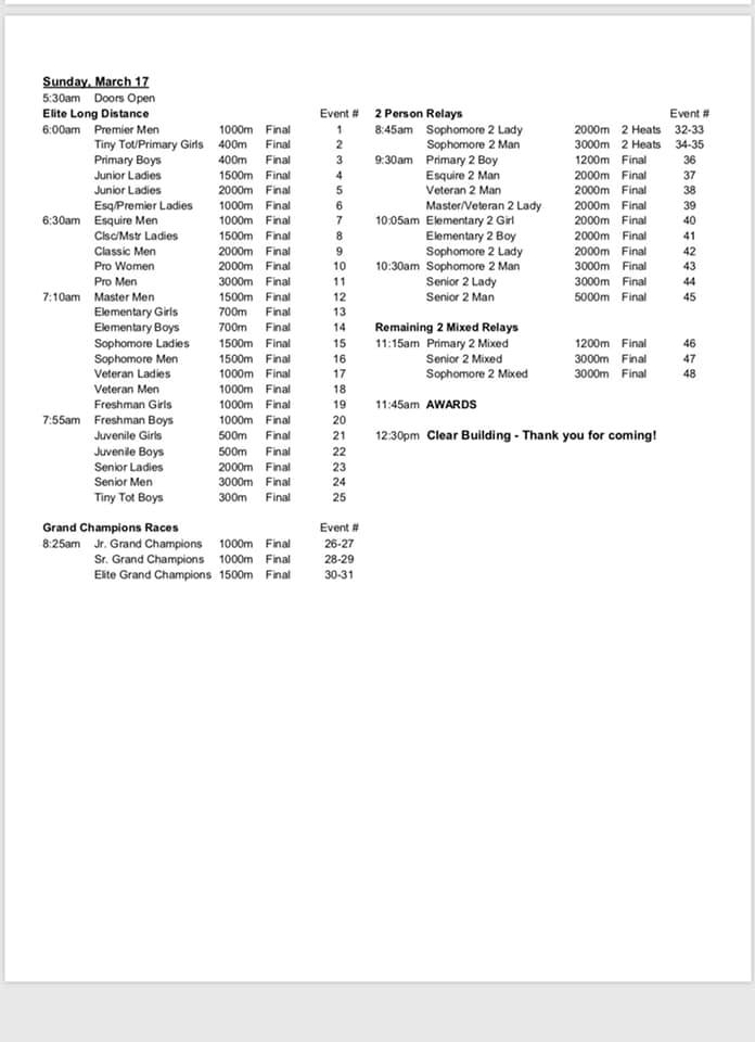 - 2 Person and 2 Mix Relays (Primary, Elementary, Sophomore, Senior, Classic, Master, Veteran)